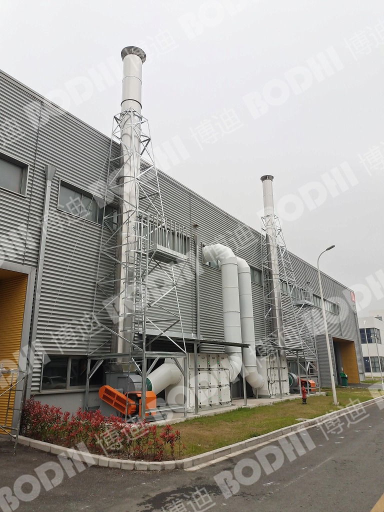 解决方式:由于设备产生的烟气温度较高,推荐使用博迪文丘里湿式除尘器,既保证设备运行的安全,又能满足过滤后的排放要求。每条生产线上均有淬火炉和回火炉。淬火炉炉口一直有废气需要燃烧排放,温度较高,需要一直吸风排走废气,并且要在管道入口处增加一套管道喷淋系统,用以降低温度隔绝火源,且具有预过滤作用。回火炉根据工况要求,每次零件回火时间达2-4小时,仅有在零件出料的1-2分钟内会有油烟冒出。为节约能耗,推荐在回火炉罩口增加自动风阀,与回火炉联动,当回火炉门打开时自动风阀打开,并控制风机变频提高风量。废气进入除尘器后经离心分离和湿式分离,达到排放浓度要求。